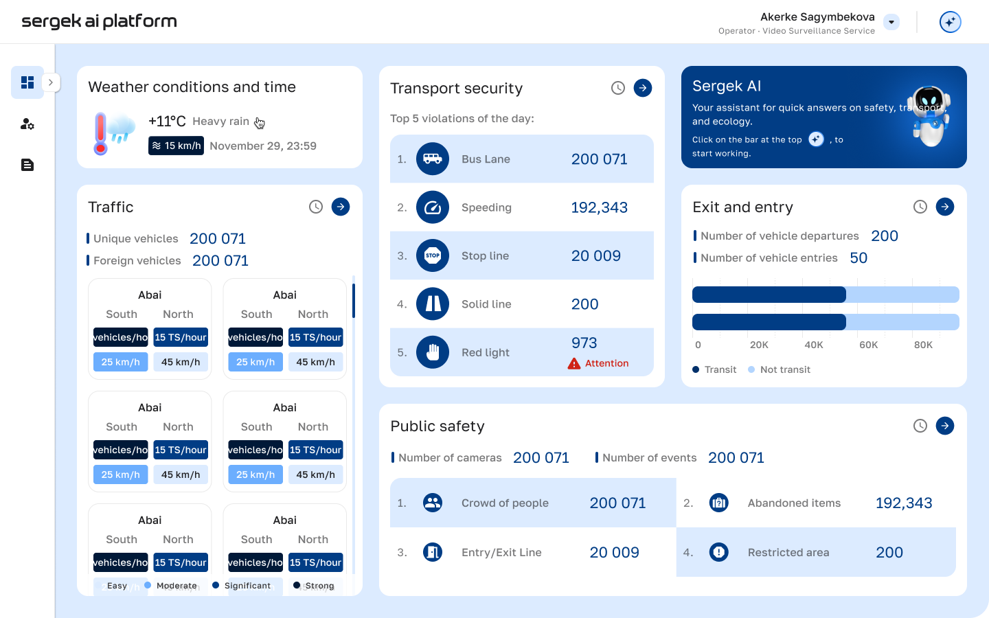 The Sergek platform is an integrated AI system for traffic and mobility management within a smart city ecosystem. It combines client-side services and data capabilities for monitoring, analysis, management, and automation. The platform integrates solutions for road and public safety, intelligent transport analytics, and environmental monitoring, and also provides open APIs for seamless integration with third-party systems and government services.