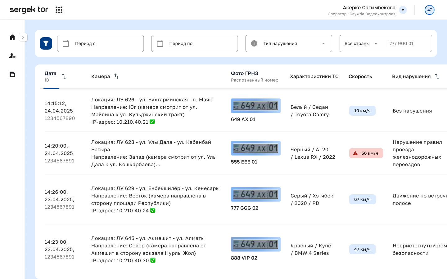 для сотрудников полиции. Мобильное приложение Sergek Qorgau предназначено для сотрудников полиции и служит инновационным инструментом, позволяющим повысить эффективность выявления нарушителей. Оно даёт возможность быстро реагировать на ориентировки и осуществлять поиск транспорта в режиме реального времени, выявлять опасное вождение, проверять нарушения, а также упрощает процесс оперативно-профилактических мероприятий за счёт быстрой выдачи предписаний и внесения данных о неустановленных транспортных средствах.
