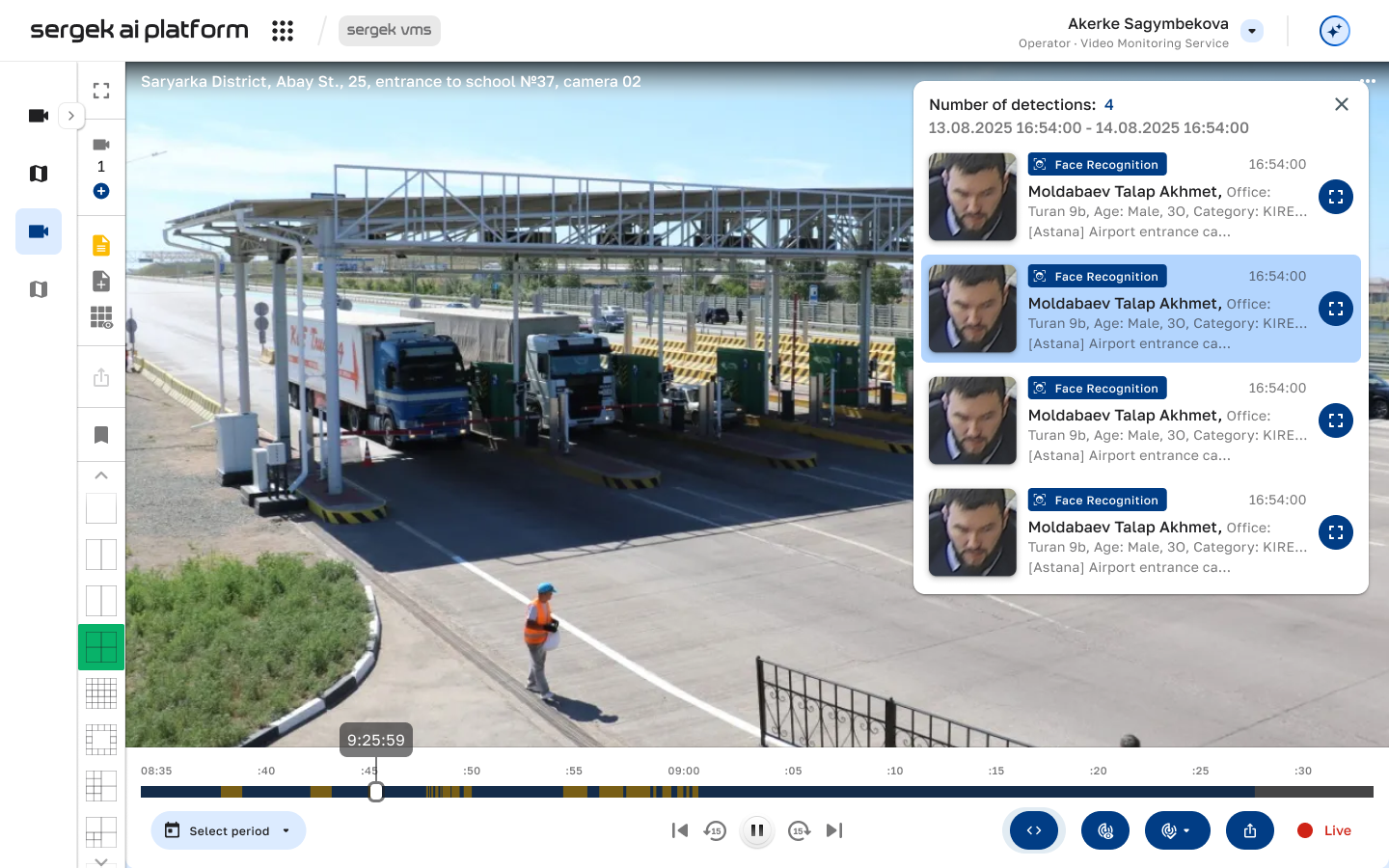 This is a comprehensive video surveillance system equipped with AI-based analytics to enhance public safety. It is designed to ensure security on city roads and streets; for children and students in educational institutions; in crowded areas; and in public locations exposed to potential terrorist threats. Key focus areas include control centers, public spaces, schools, kindergartens, other educational institutions, hospitals, residential complexes, and critical infrastructure sites.