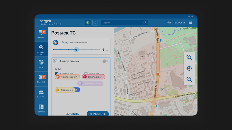 для сотрудников полиции. Мобильное приложение Sergek Qorgau предназначено для сотрудников полиции и служит инновационным инструментом, позволяющим повысить эффективность выявления нарушителей. Оно даёт возможность быстро реагировать на ориентировки и осуществлять поиск транспорта в режиме реального времени, выявлять опасное вождение, проверять нарушения, а также упрощает процесс оперативно-профилактических мероприятий за счёт быстрой выдачи предписаний и внесения данных о неустановленных транспортных средствах.